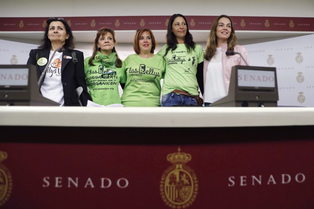 Foto de la portavoz territorial de Las Kellys de Lanzarote, Myriam Barros, junto a la parlamentaria de Nueva Canarias, María José López, durante una rueda de prensa en el Senado. EFE/ Juan Carlos Hidalgo