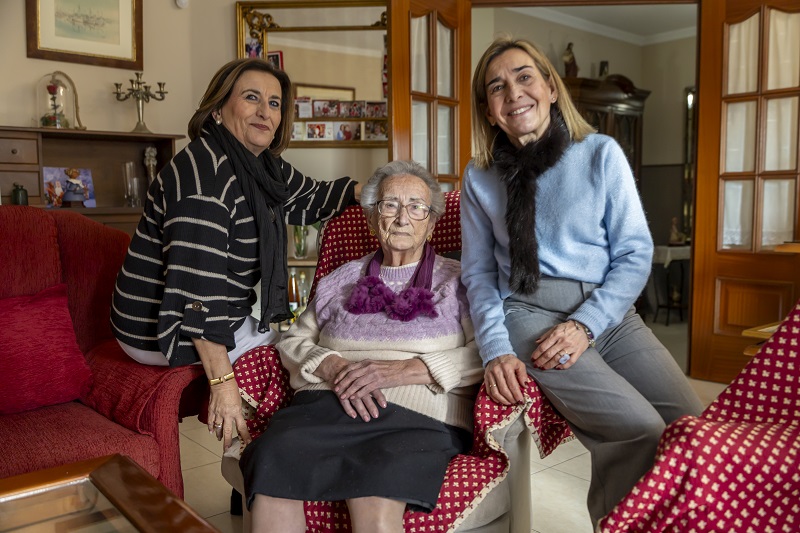 MELILLA, 07/02/2026.-Isabel Oses Huertas (c), posa con sus hijas Isabel (i) y Rosa. Tiene 100 años y un mes, y una agilidad física y mental que sorprende a cualquiera. EFE/ Giner