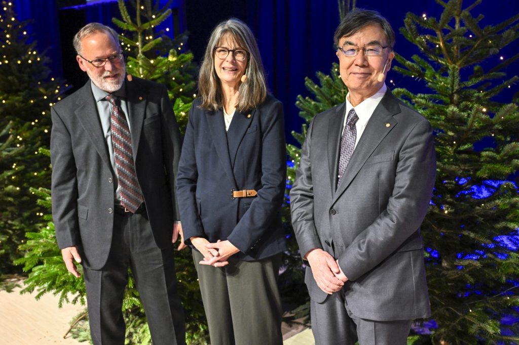 Foto del inmunólogo estadounidense Fred Ramsdell, la bióloga molecular e inmunóloga Mary E. Brunkow y el inmunólogo japonés Shimon Sakaguchi, galardonados con el Nobel de Medicina 2025, en el Aula Medica de Estocolmo. EFE/EPA/HENRIK MONTGOMERY
