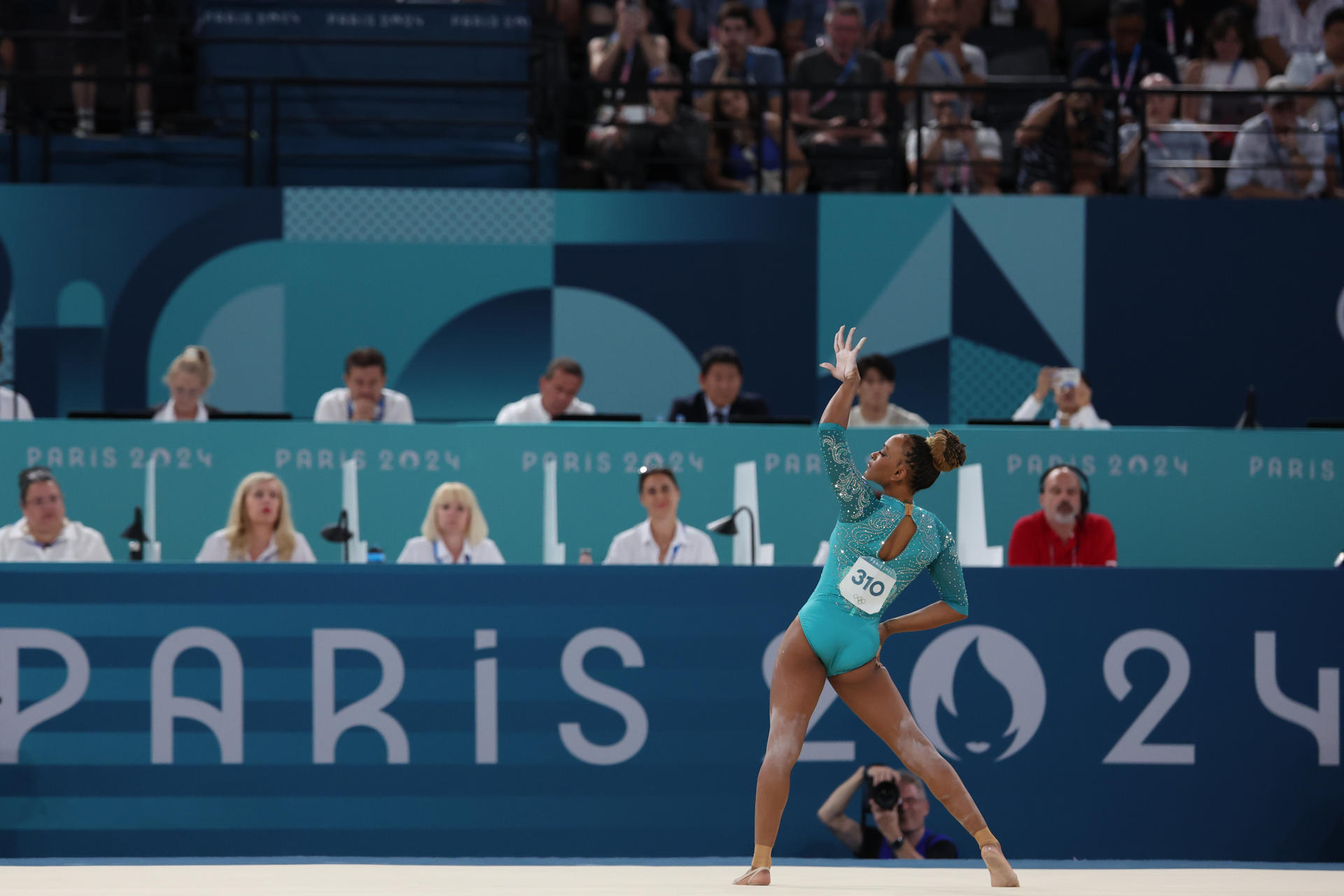 Rebeca Andrade durante la ejecución de su ejercicio en la final de suelo femenino de gimnasia artística de los Juegos Olímpicos de París 2024. EFE/ Miguel Gutiérrez
